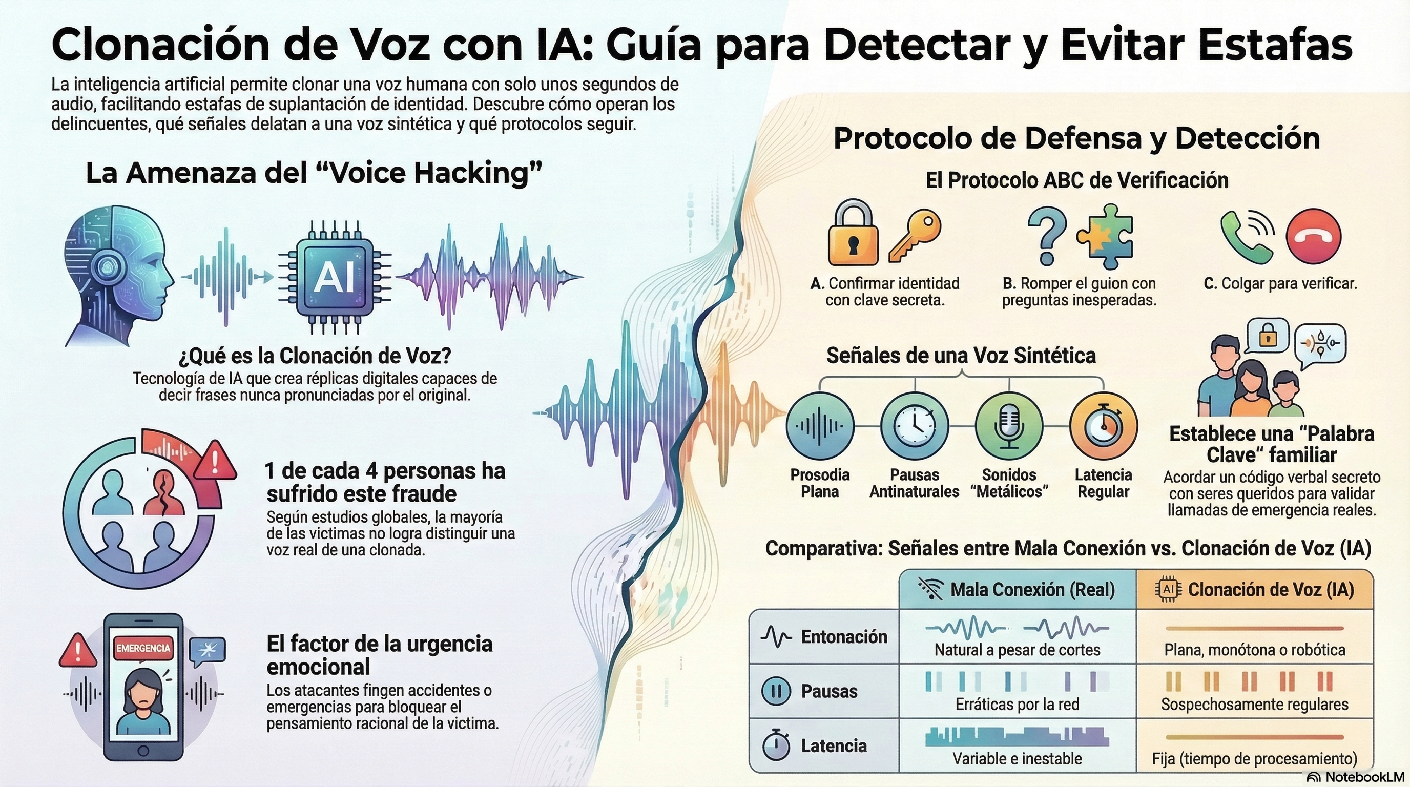 ETIQUETAS: voice cloning, clonación de voz IA, deepfake de audio, fraude por voz artificial, suplantación de identidad digital, ciberseguridad familias 2026, riesgos inteligencia artificial, ingeniería social avanzada