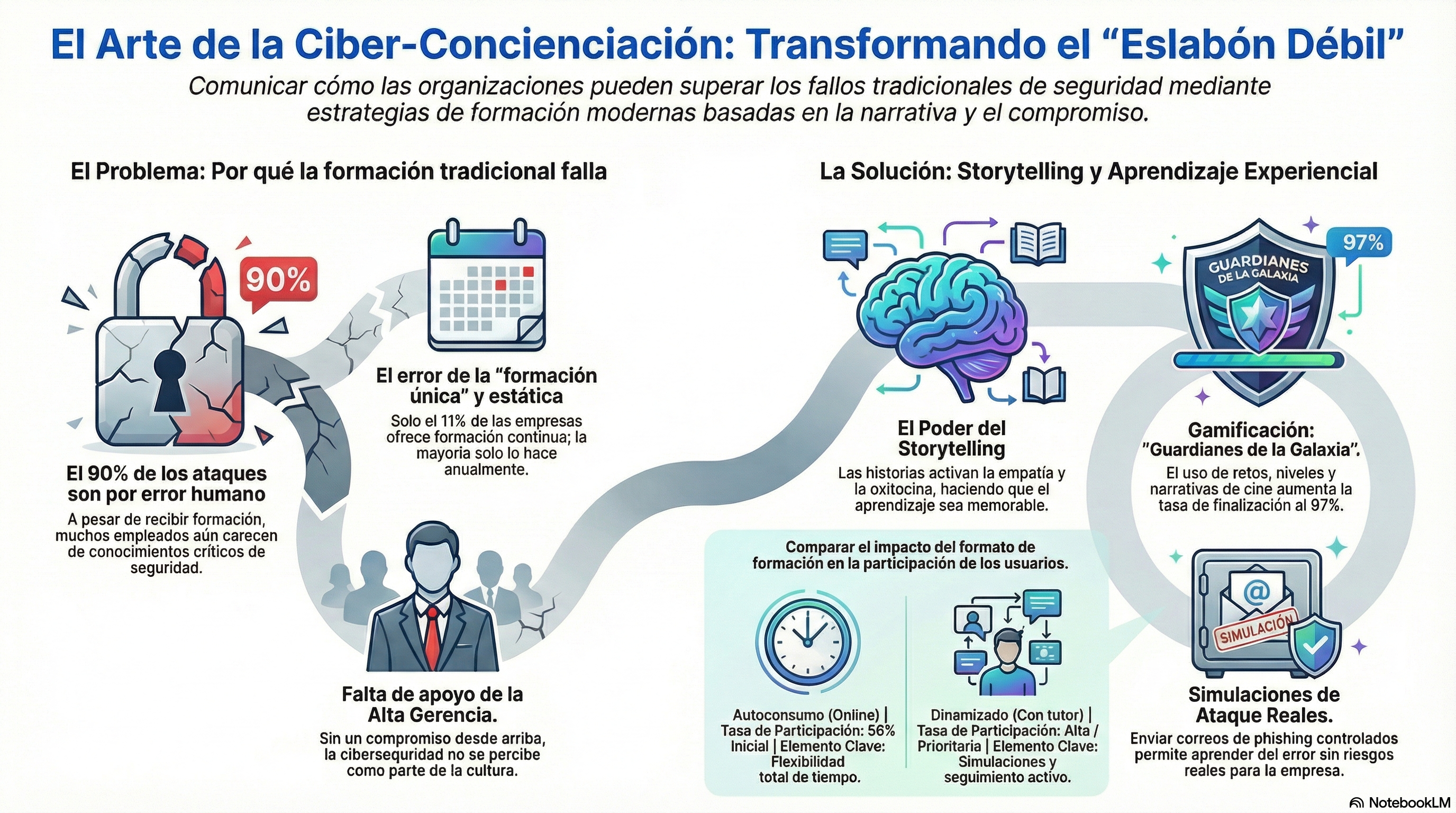 Después, el anzuelo. Un caso real. Siempre. No un caso inventado, no una estadística genérica. Un caso concreto, con nombres cambiados si hace falta, pero con detalles reales que hagan pensar "esto le podría pasar a alguien que conozco". La ingeniería social —esa capacidad que tienen los atacantes de manipular la psicología humana para obtener lo que quieren— es mucho más fácil de entender cuando la ves aplicada a una situación cotidiana que cuando te la explican en abstracto.