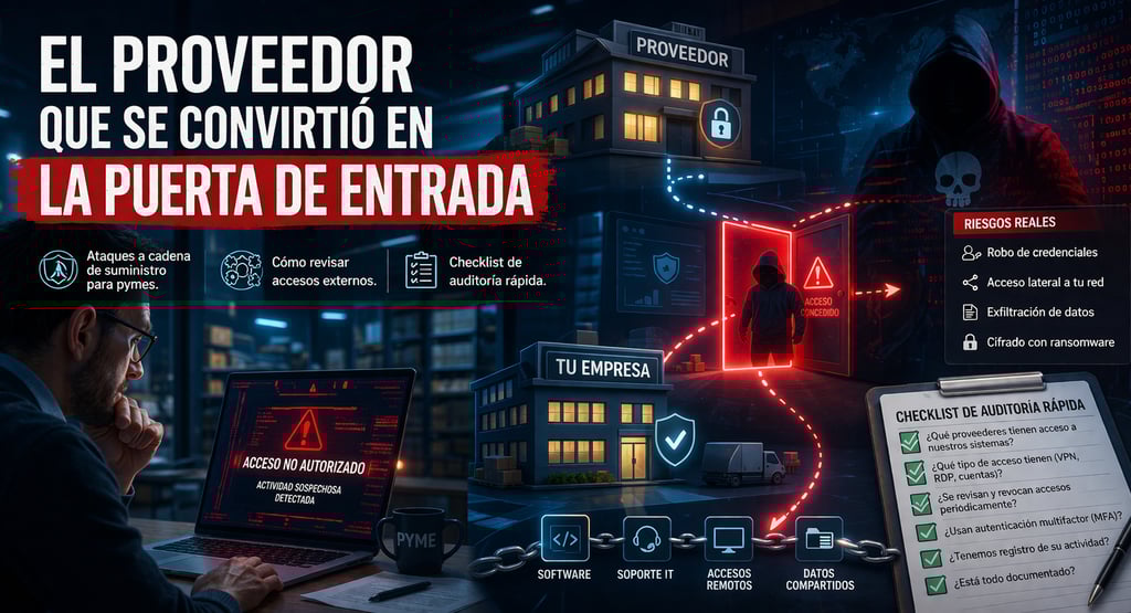El acceso heredado que nadie revocó. Una empresa de servicios IT terminó un proyecto hace ocho meses. El acceso VPN que se le concedió para trabajar sigue activo. Nadie lo revisó. El atacante que comprometió a esa empresa de IT tiene ahora las credenciales de acceso a tu red. Esto no es un escenario hipotético: es el origen de algunos de los incidentes más graves documentados en los últimos dos años.