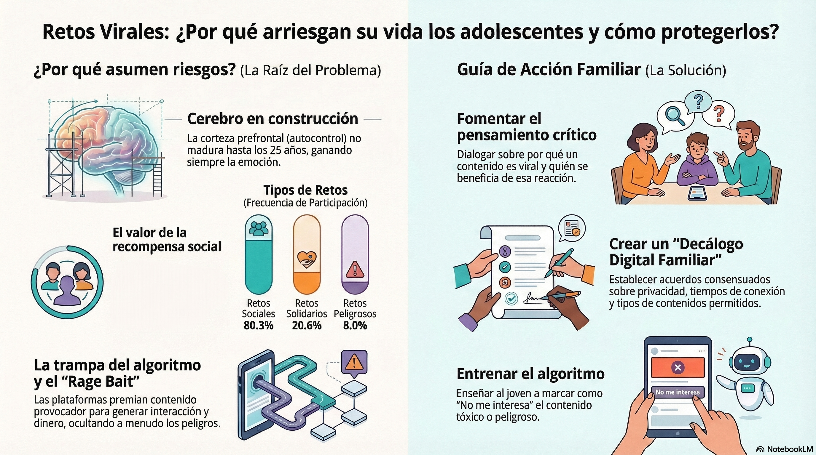 En el nivel familiar: Habla de retos virales concretos con tus hijos, no en abstracto. La conversación del tipo "cuidado con Internet" no tiene efecto. La conversación sobre un caso específico, reciente y real, sí lo tiene. El objetivo no es provocar miedo sino desarrollar la capacidad de análisis crítico ante la presión del grupo.