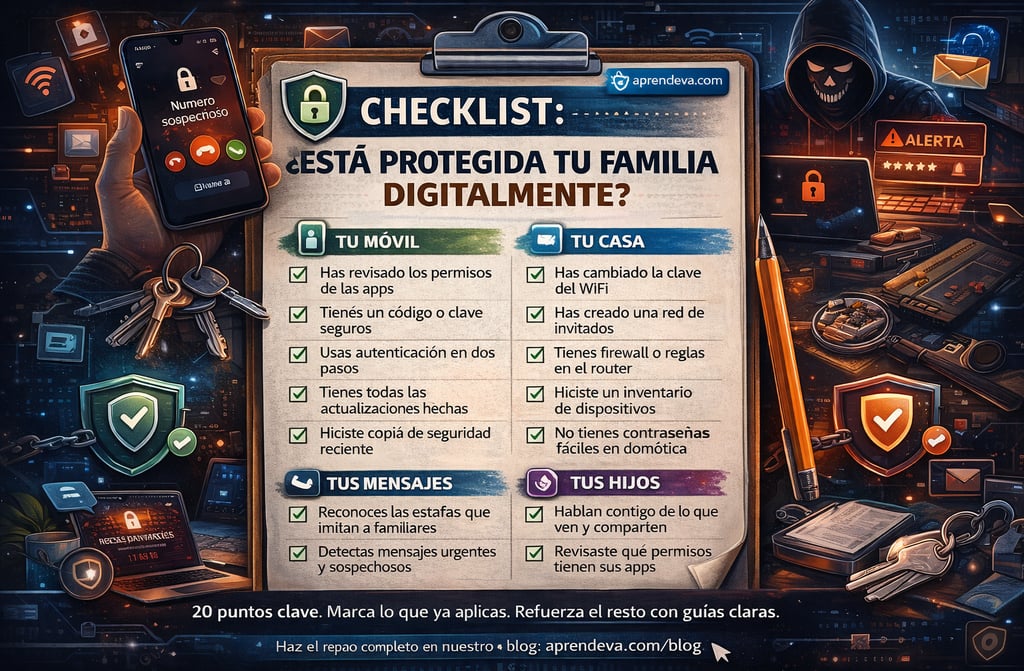 [ ] 16. Tenemos acordada una palabra clave de verificación para llamadas urgentes o inusuales entre miembros de la familia.