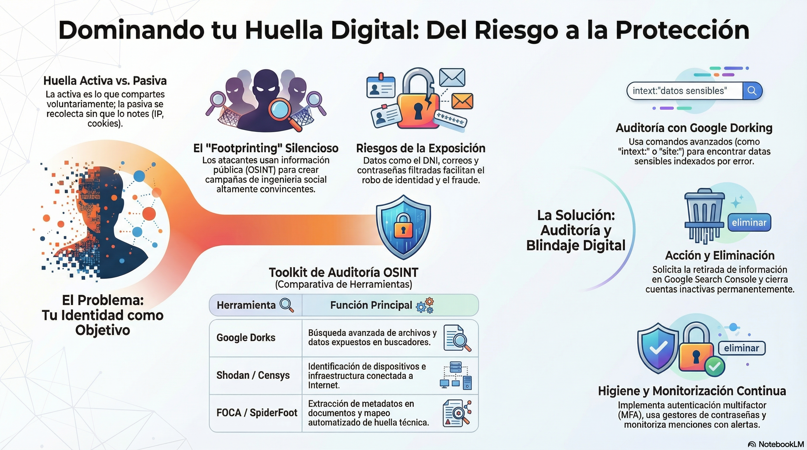 Esto se llama auditoría de huella digital y es lo primero que hace cualquier profesional de ciberseguridad antes de un test de intrusión. Puedes hacerlo tú mismo en menos de 30 minutos: