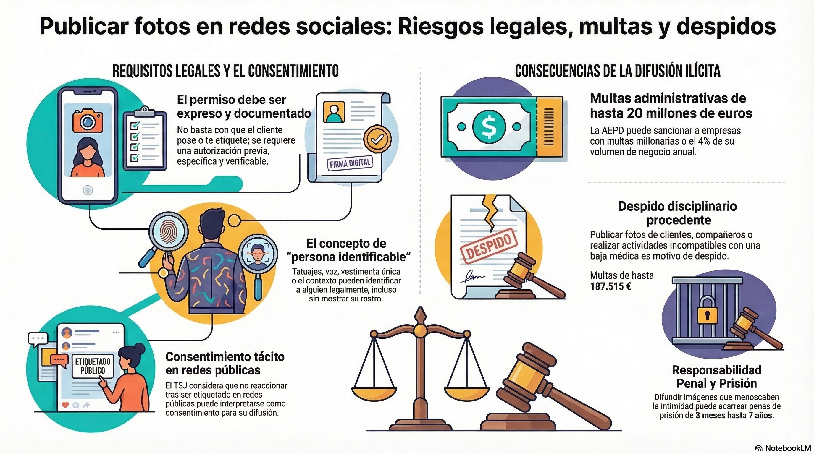 ¿La consecuencia práctica? Si publicas una foto de un compañero de trabajo sin que él o ella lo haya autorizado expresamente, puedes estar infringiendo su derecho fundamental a la imagen y violando la normativa de protección de datos al mismo tiempo.