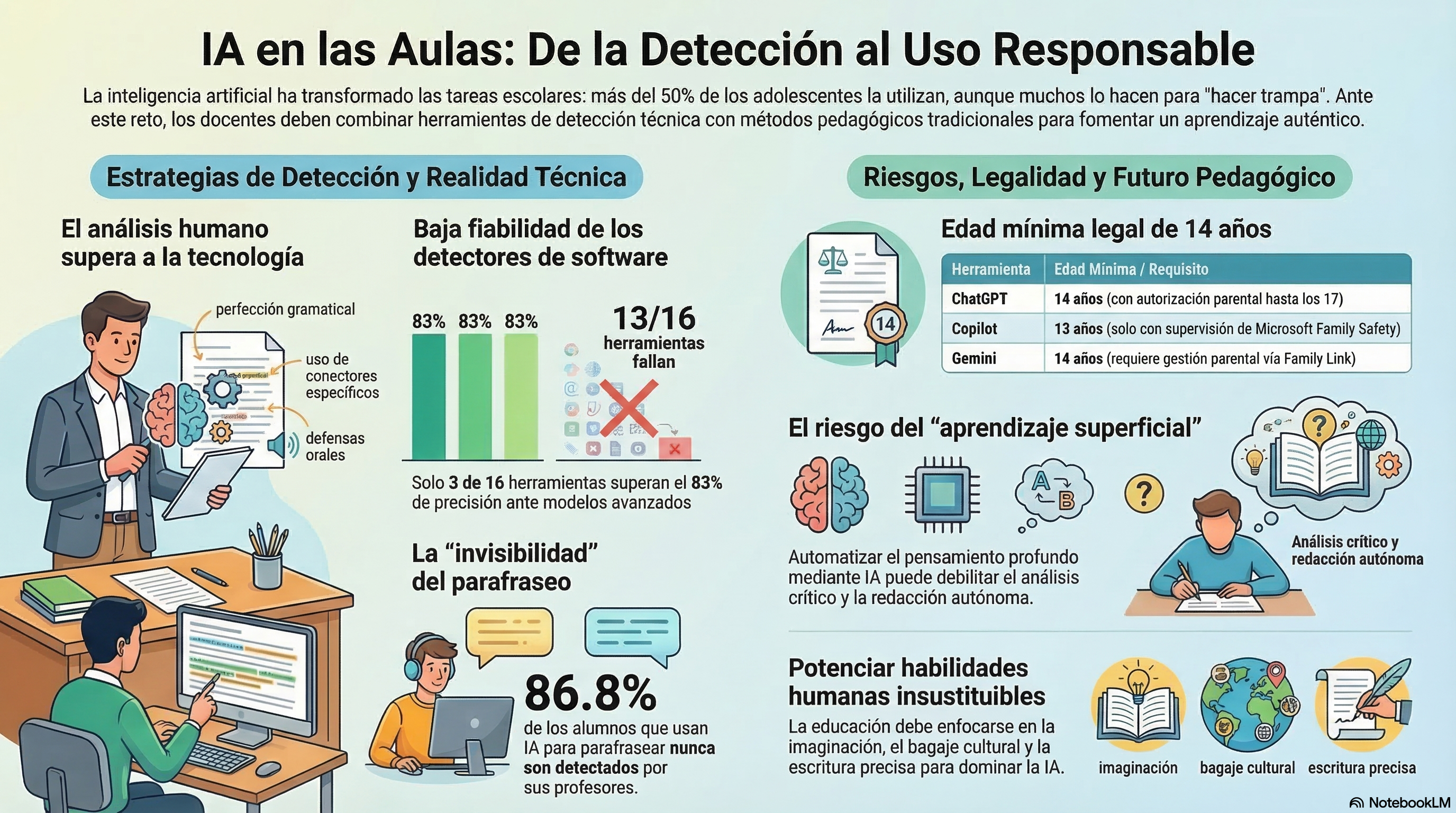 Para docentes: El diseño de la tarea importa más que la detección del uso. Una tarea bien diseñada hace que usar la IA sin pensar no sirva de nada. Evalúen proceso, no solo producto.