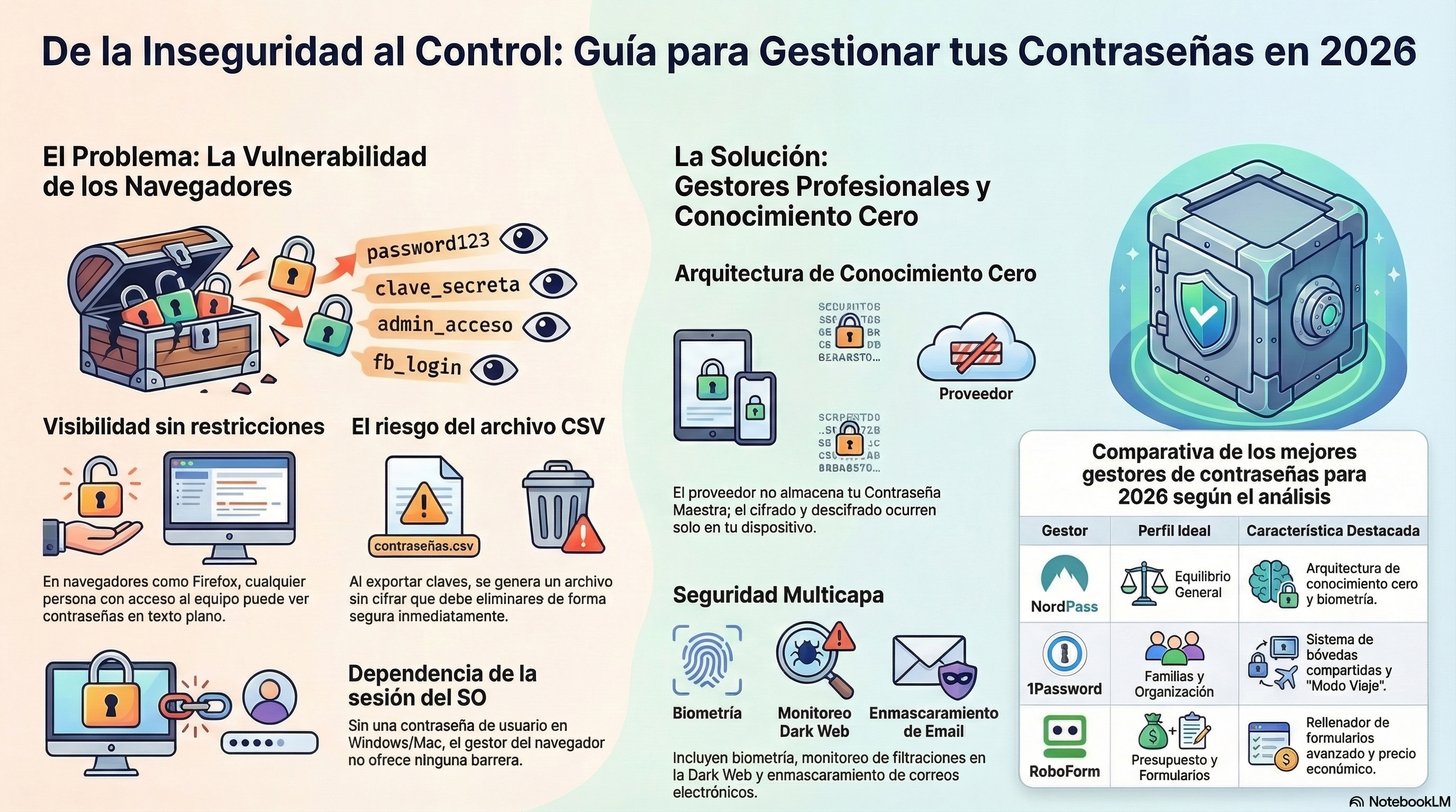 Los gestores del navegador están vinculados a ese navegador y a esa cuenta. Si cambias de dispositivo, de navegador o tu cuenta se ve comprometida, el acceso a esas credenciales puede interrumpirse. Su nivel de cifrado y su modelo de conocimiento cero son, en general, menos robustos que los de los gestores dedicados. Y, crucialmente, no generan ni auditan contraseñas de forma tan sofisticada ni ofrecen las funciones adicionales —alertas de brechas, compartición segura, acceso de emergencia— que hacen a los gestores especializados genuinamente valiosos.